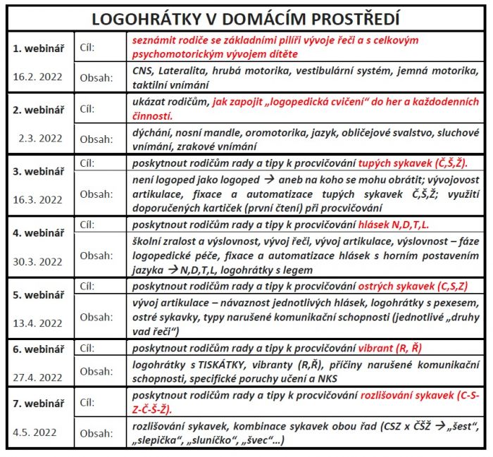 Hlavní náplní webinářů bude vývoj řeči dítěte a tipy na to, jak jej podpořit a preventivně předcházet vadám řeči. Posluchači si odnesou tipy, rady a videoukázky pro efektivní rozvoj komunikačních schopností dítěte (propojování rozvoje řečových schopností s různými dílčími činnostmi podporujícími celkový psychomotorický vývoj dítěte).