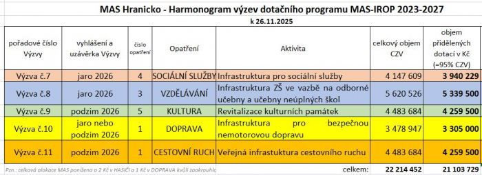 Po 6 vyhlášených Výzvách a splnění stanoveného milníku čerpání byla ze strany MMR uvolněna dodatečná alokace 17,5 mil. Kč, k níž MAS přičetla dosud nevyčerpanou alokaci 3,5 mil. Kč z ponížených a nezrealizovaných projektů z již dříve vyhlášených výzev. Valná hromada MAS Hranicko tak na svém jednání 25.11.20225 rozhodla o nasměrování alokace cca 21 mil. Kč do celkem 5 oblastí podpory. Výbor MAS teprve stanoví Harmonogram Výzev, proto zde uvádíme pouze časový odhad: