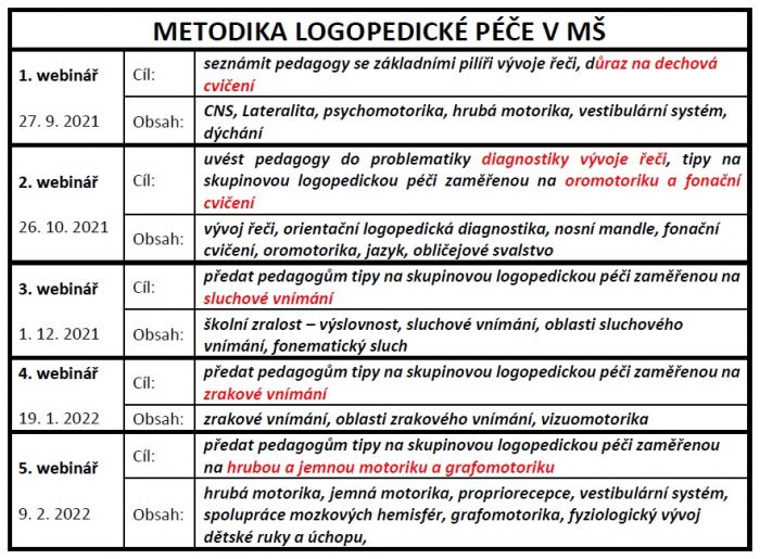 První webinář byl zaměřen na dechová cvičení, druhý na oromotoriku a fonační cvičení, třetí webinář proběhne 1. prosince se zaměřením na sluchové vnímání, pokud se chcete přidat, využijte pozvánku v příloze. V dalším roce proběhnou ještě 2 webináře se zaměřením na zrakové vnímání a hrubou a jemnou motoriku.