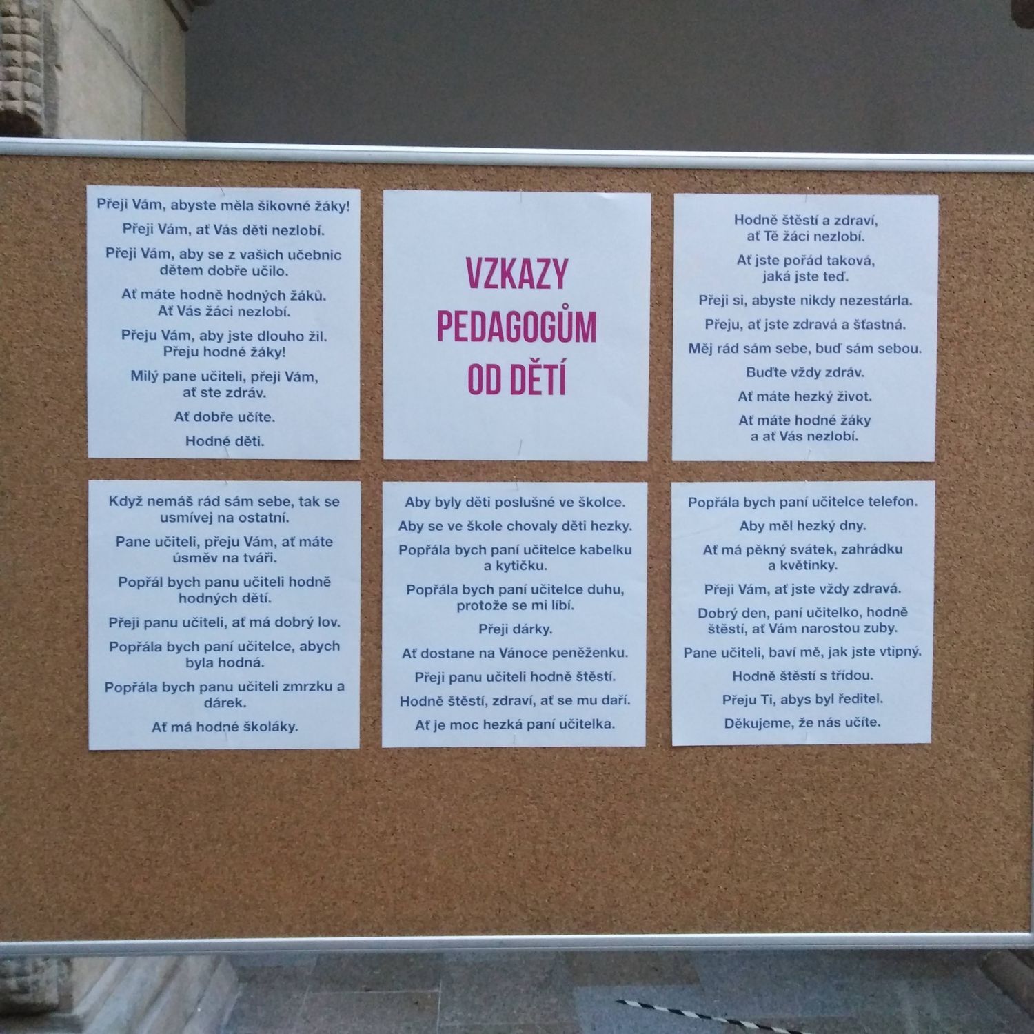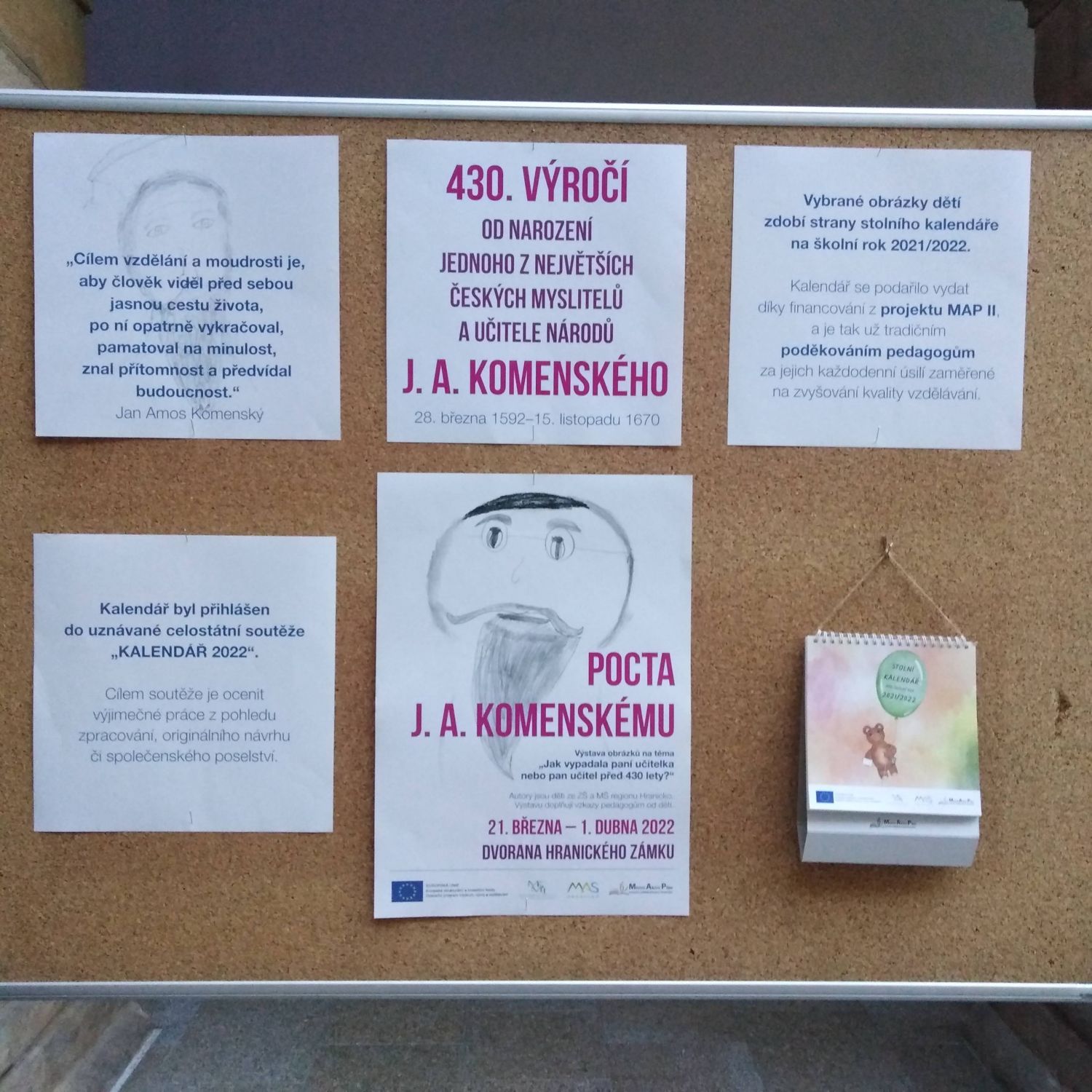 Na to se můžete podívat ve dvoraně hranického zámku, kde bude do 1. dubna 2022 k vidění výstava obrázků, ze kterých vznikl školní stolní kalendář na tento školní rok. Výstava je zorganizována jako pocta J. A. Komenskému a doplňují ji vzkazy dětí pedagogům.